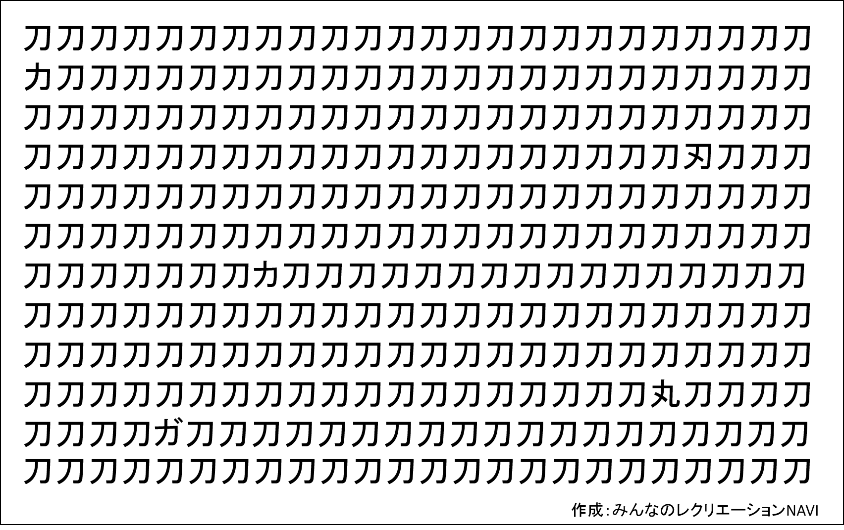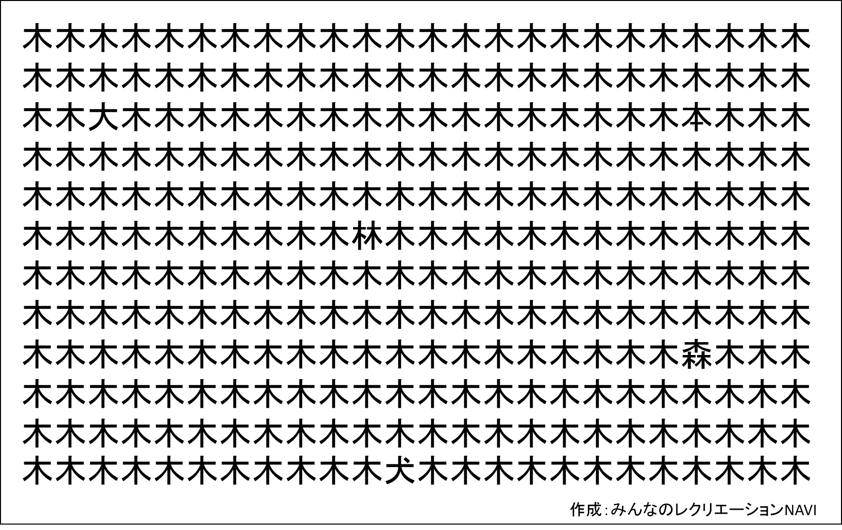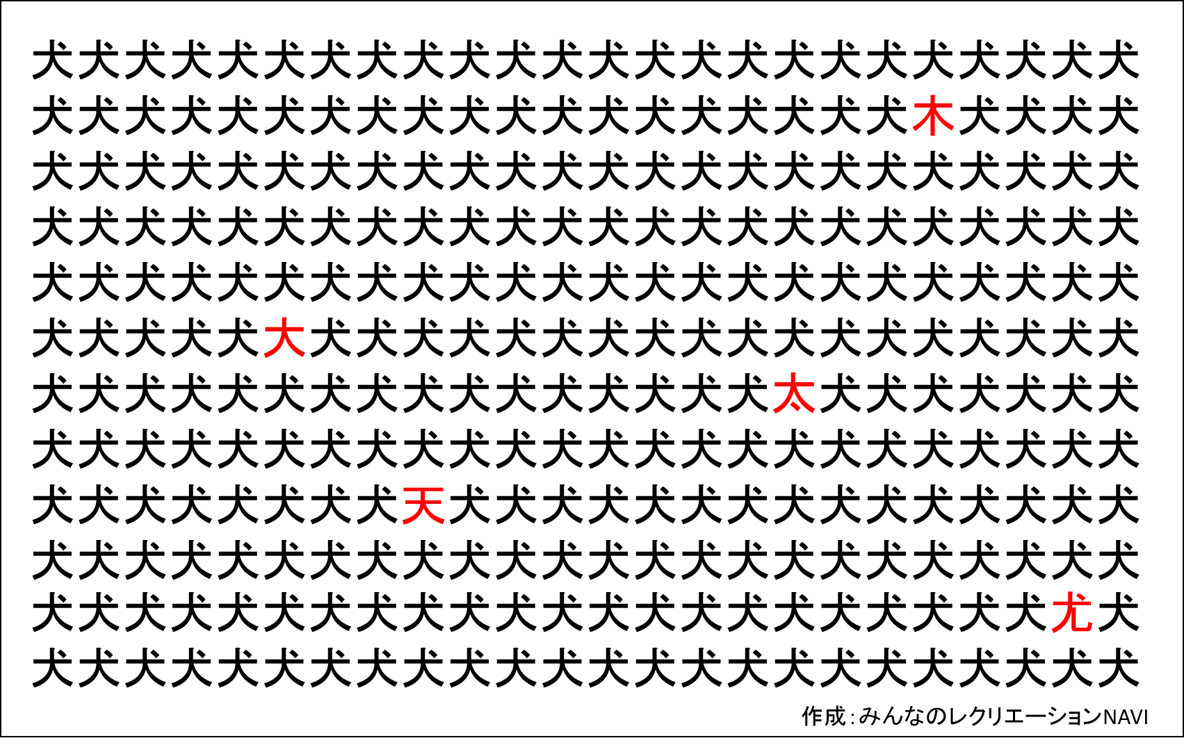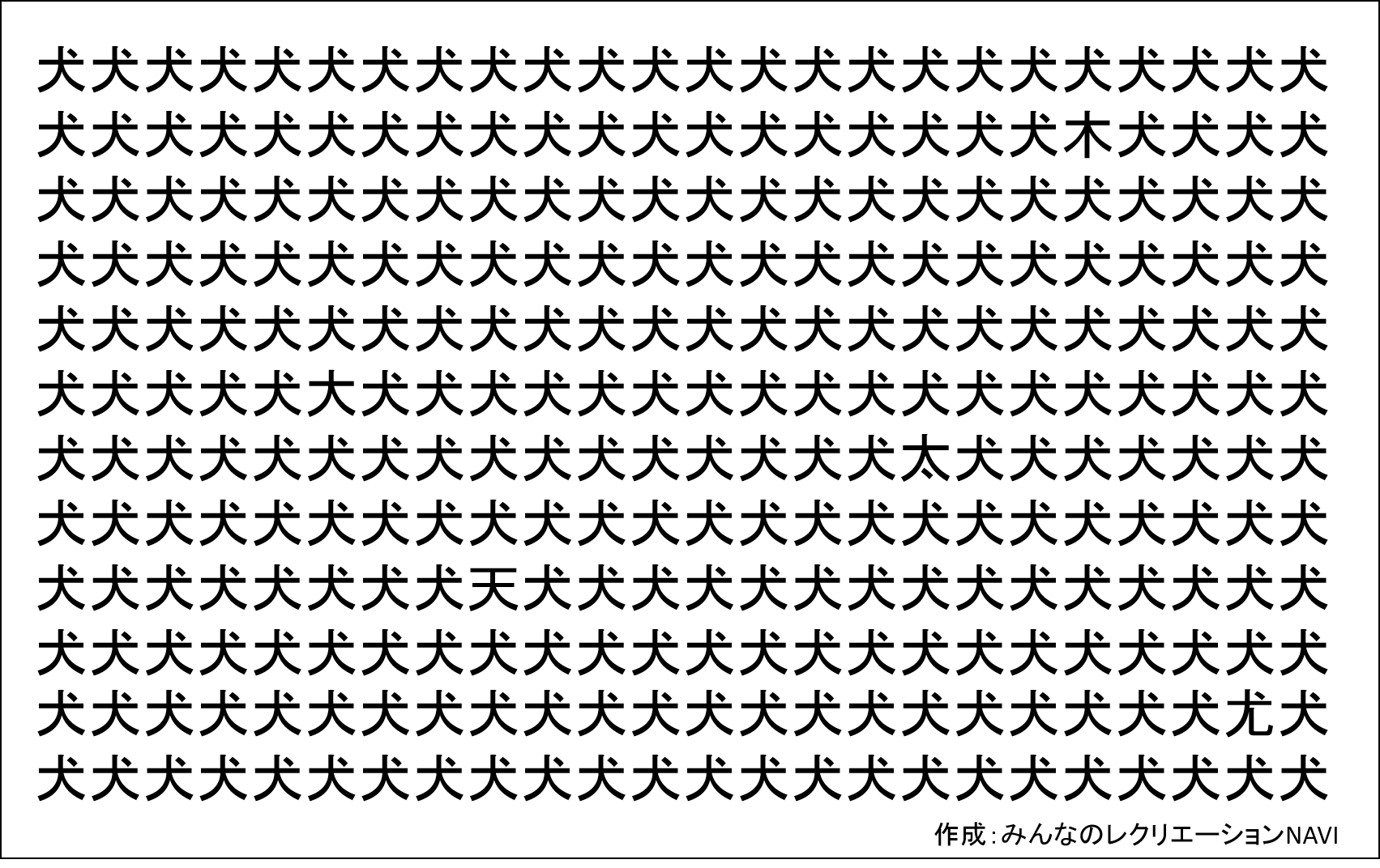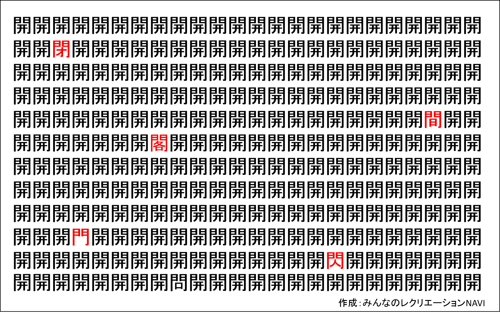 たくさんの同じ漢字が並んでいる中には、微妙に異なる漢字が5つ混ざっています。